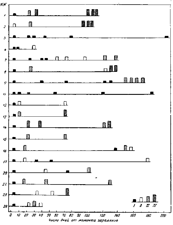 Различная степень выраженности дерматита (I—IV) у 18 человек при повторном заражении церкариями трихобильхарций (Т. stagnicolae) (по Оливьеру, 1949)