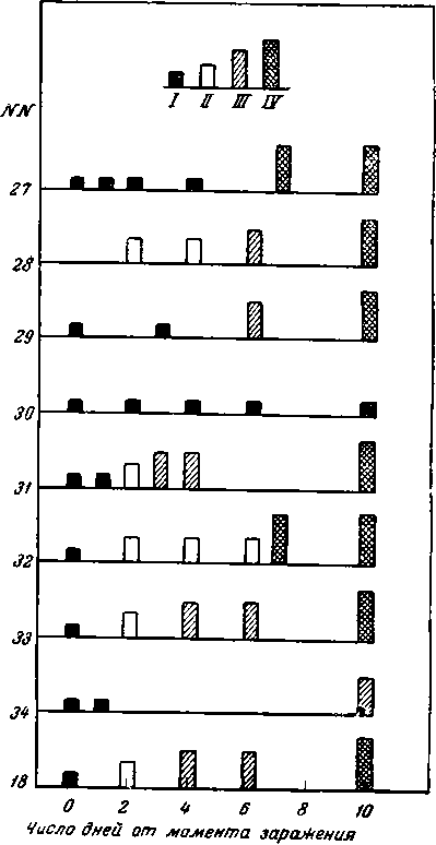 Схемы, изображающие интенсивность дерматита (I—IV) у 9 человек, при повторном заражении церкариями трихобильхарций (Т. stagnicolae) с небольшими интервалами (в течение первых 10 дней после первичного заражения (по Оливьеру, 1949)