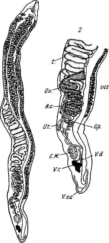 1 — общий вид; 2 — увеличенный задний конец тела; В.с. — половая бурса; С.М. — тельце Мелиса; G.p. — половое отверстие; Ov. — яичник; t. — семенники; Ut.— матка; V.r.—желточный пузырь; V.ex — экскреторный пузырек; V.d. — желточный проток; vit. — желточники.