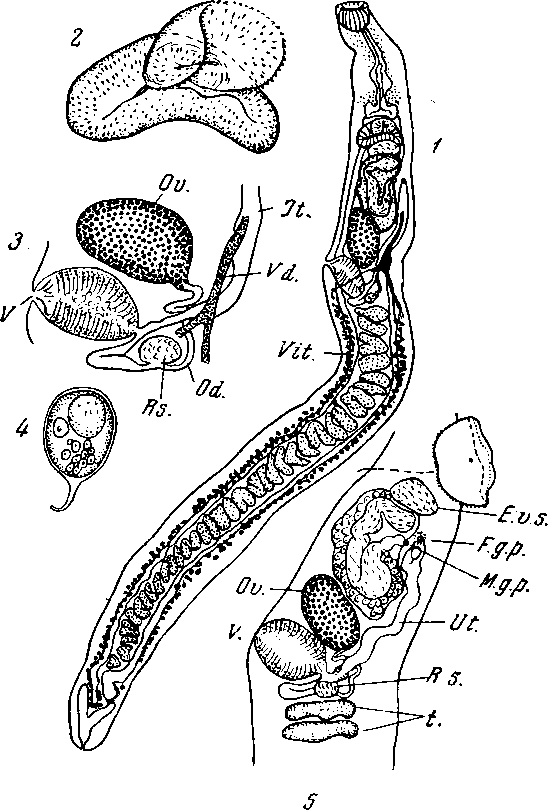 1 — общий вид; 2 — брюшная присоска в развернутом виде; 3 — детали женской половой системы; 4 — яйцо; 5 — женская и мужская половая система; E.v.s. — наружный семенной пузырек; E.g.p. — женское половое отверстие; Ov. — яичник: Od. — яйцевод; R.s. — receptaculum sernini; t. — семенники; Ut. — матка; Vit. — желточники; Vd. — желточный проток; V. — "орган Лауромелиса"; M.g.p. — мужское половое отверстие