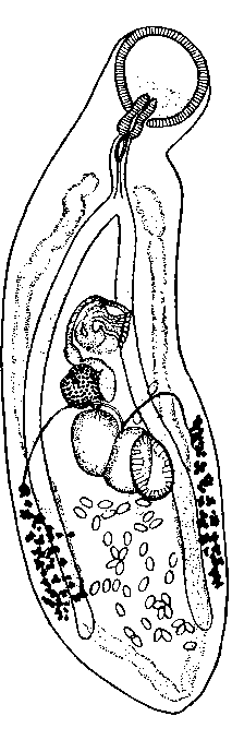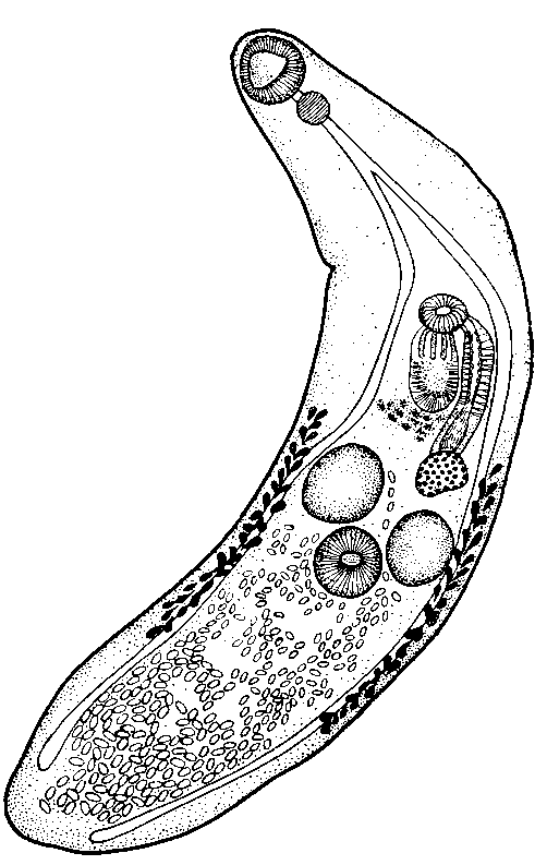 Яичник, достигающий 0,08—0,18 X 0,06—0,18 мм, лежит немного впереди левого семенника. Диффузная масса тельца Мелиса находится на медианной линии между семенниками и яичником.