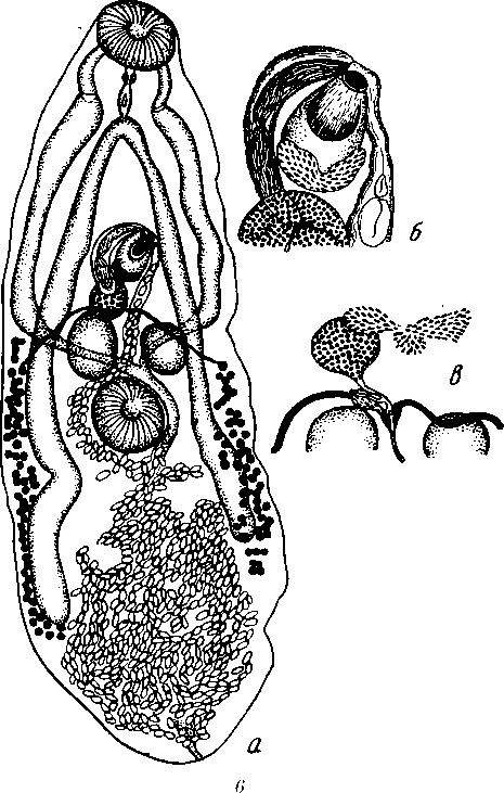 а - общий вид; б — концевой половой аппарат; в — расположение половых органов