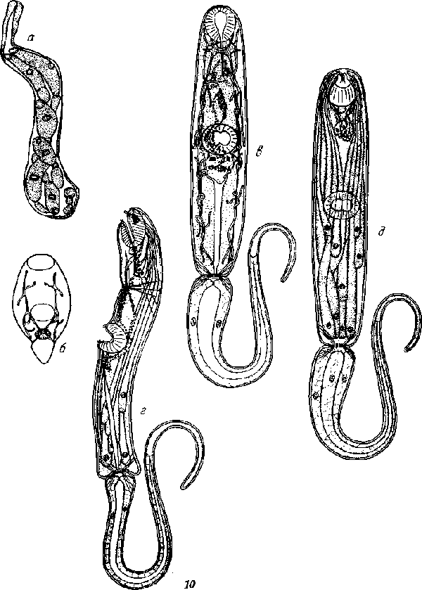 Стадии развития: а — спороциста; б, в, г, д — церкарии (в—расположение пламеневидных клеток; г, д — расположение жслев проникновения)