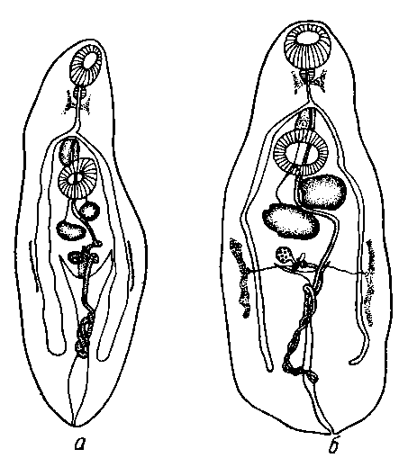 Молодые формы: a — на 12-й день после заражения дефинитивного хозяина; б — на 14-й день после заражения