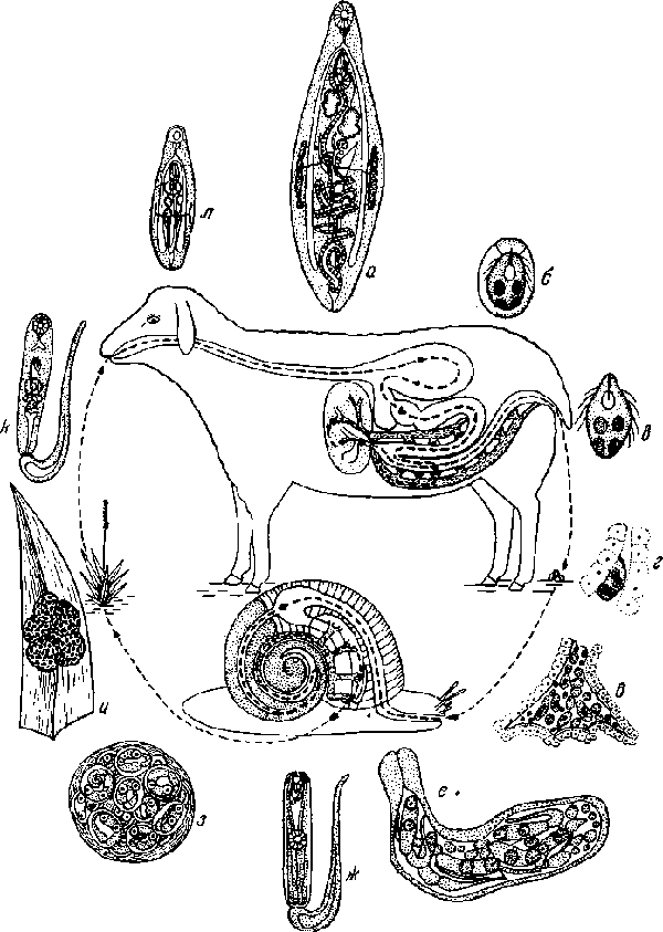 a — имаго; б — яйцо; в — вылупившийся мирацидий; г — мирацидий в кишечной железе моллюска; д — формирование спороцисты; е — дочерняя спороциста с церкариями; ж— церкарий из дочерней спороцисты; з — цистообразное скопление церкариев; и — скопления церкариев, выделенных моллюсками на листьях растений; к — церкарий, освободившийся из цисты; л — молодая марита. В центре дефинитивный хозяин — овца и промежуточный хозяин — сухопутный моллюск