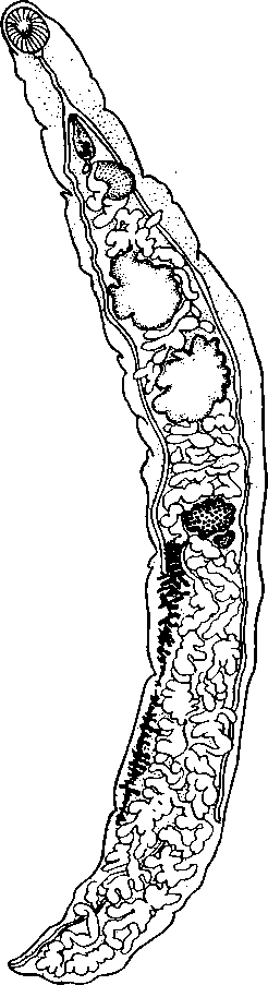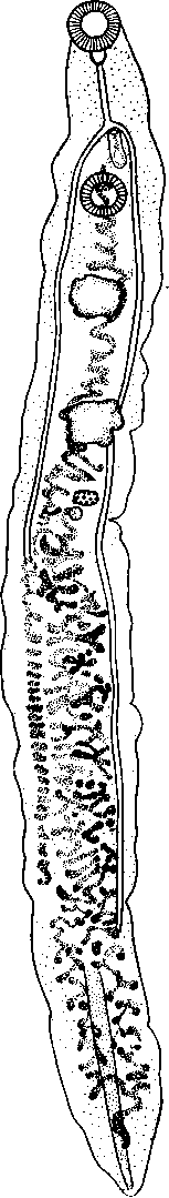 Пищевод 0,34 мм длины, разветвляется впереди полового отверстия на кишечные стволы, которые заканчиваются на уровне заднего края желточника. Семенники почти одинакового размера, расположены между стволами кишечника в передней половине тела. Промежуток между ними равен половине продольного диаметра заднего семенника. Половая бурса грушевидной формы, содержит извитой пузырек и циррус. Яичник лежит слева, позади семенников. Размер яичника равен размеру заднего семенника.