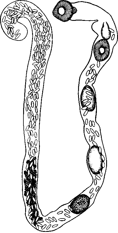 Яйца крупные, с толстой оболочкой (0,003 мм), молодые —желтого, зрелые —темнокоричневого, даже черного цвета. Размер их в передних отделах матки 0,049 —0,058 X 0,026 —0,037 мм.