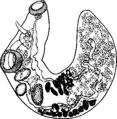 Половое отверстие открывается на расстоянии 0,464 мм от головного конца. Цельнокрайные кругловато-овальные семенники расположены наискось один позади другого. Диаметр переднего семенника 0,20 X 0,137 мм, заднего 0,172 X 0,137 мм. Овальный яичник 0,276 мм длины и 0,155 мм ширины, лежит позади и вправо от заднего семенника. Желточники расположены в средней трети тела. Начинаются они на границе заднего края яичника и отстоят от заднего конца тела на расстоянии 0,978 мм. Основная масса петель матки лежит в задней трети тела. Половая бурса 0,176 х 0,145 мм. Яйца достигают 0,0469 мм длины и 0,027 мм ширины.