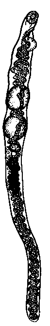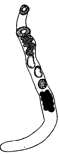 Семенники с не очень правильными очертаниями, обычно удлинены в поперечном направлении; их диаметры 0,23 х 0,24 мм и 0,30 х 0,19 мм.