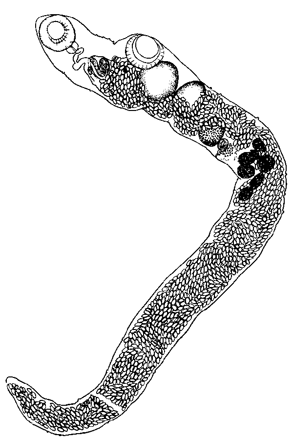 Желточники состоят из немногочисленных очень крупных фолликулов и занимают почти всю ширину тела на протяжении 0,30—0,45 мм. Они в большей своей части закрыты петлями матки и оканчиваются на расстоянии 1,9—2,4 мм от заднего конца тела. Матка, вместе со своими нисходящей и восходящей ветвями, занимает все тело позади яичника. Восходящая ветвь образует группу петель между яичником и задним семенником, проходит дорзально относительно семенников и брюшной присоски и образует впереди последней небольшое скопление петель. Оболочка зрелых яиц темножелтого, почти черного цвета. Яйца снабжены крышечками и достигают 0,038—0,045 мм длины и 0,22—0,26 мм ширины. Экскреторный пузырь простой и удлиненный.