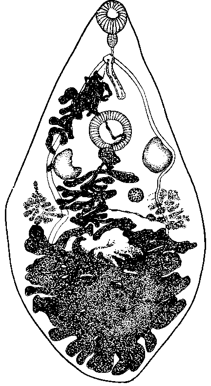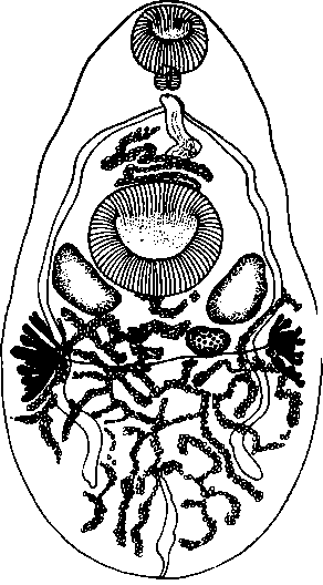 Затем она направляется вперед, пересекает наискось брюшную присоску и, переходя в половое отверстие, образует значительную кругообразно извитую группу петель, расположенную на стороне, противоположной той, на которой лежит яичник, выйдя за границу соответствующих кишечных ветвей. Многочисленные яйца снабжены утолщенной оболочкой коричневого цвета, имеющей крышечку на одном из полюсов; длина их 0,042—0,048 мм при ширине 0,023—0,027 мм.