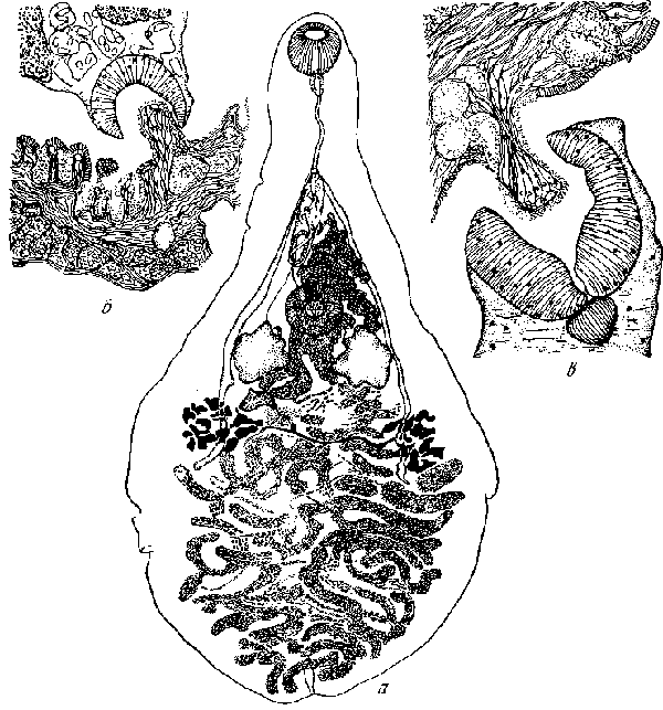 a — взрослый экземпляр; б — срез участка панкреаса с брюшной присоской, прикрепленной к стенке tubule; в — срез участка панкреаса с ротовой присоской, прикрепленной к стенке tubule.