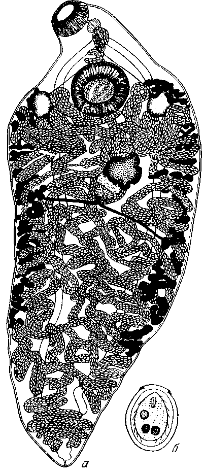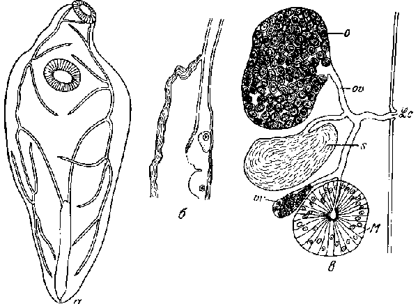 a — строение экскреторной системы; б — передний конец экскреторного пуэыря, соединенный с одним из собирательных протоков; в — соотношение женских половых органов: о — яичник, ov — яйцевод; Lc — лауреров канал; s — семяприемник; vr — желточный резервуар, М — тельце Мелиса