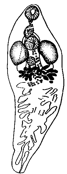 Крупные компактные округлые семенники лежат рядом, приблизительно на границе передней и средней трети длины тела. Передняя часть разделяющего их пространства занята задней половиной брюшной присоски. У некоторых экземпляров семенники свальные, продольно-удлиненные, у других они слегка лопастные.