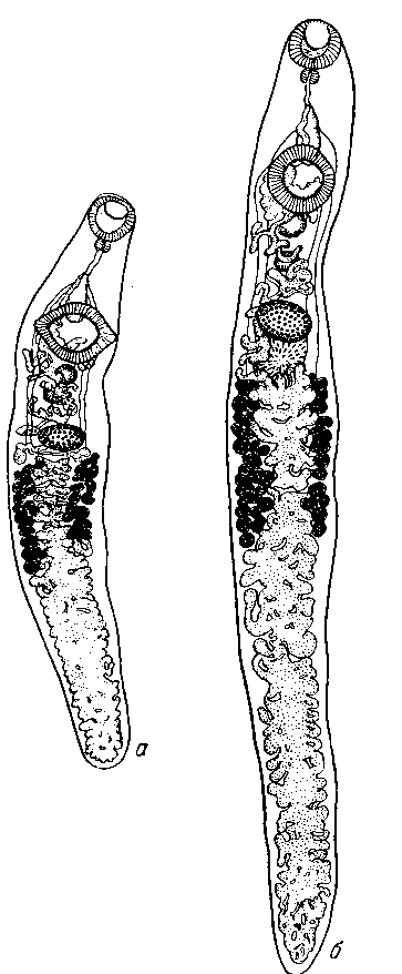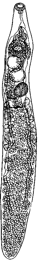 Кишечные стволы широкие, почти прямые, простираются до конца средней трети длины тела. Половое отверстие лежит впереди бифуркации, позади фаринкса. Половая бурса достигает зоны брюшной присоски; она относительно крупная, 0,12—0,15x0,04— 0,06 мм, и содержит циррус, простатическую часть и скрученный семенной пузырек. Семенники лежат один позади другого или несколько наискось, причем они отделены друг от друга густыми петлями матки. Передний семенник удален от брюшной присоски, отделяясь от последней петлями матки. Семенники круглые или поперечно удлиненные и достигают 0,12— 0,10 х 0,056 мм. Яичник лежит позади заднего семенника или соприкасается с ним; он удлиненной формы и достигает 0,12—0,10 X 0,13—0,7 мм. Тельце Мелиса лежит позади яичника.
