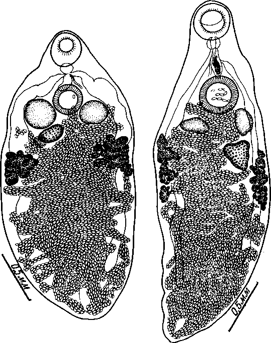 Яичник имеет овальную или более или менее квадратную форму, с гладкими или слегка неровными краями; размер его достигает 0,15—0,21x0,10—0,23 мм, а длинная его ось чаще лежит по диагонали по отношению к длинной оси тела. Семяприемник расположен дорзально относительно медиального края яичника и равен приблизительно 1/3 размера последнего. Тельце Мелиса лежит медианно, сейчас же позади яичника.