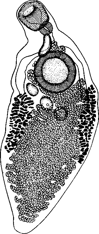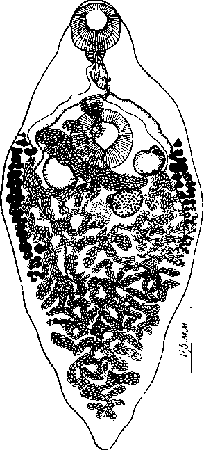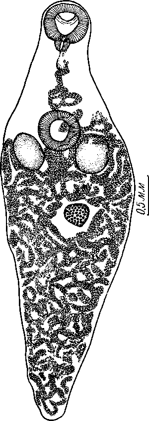 В общем все три железы лежат как бы на одной линии, образующей острый угол с продольной осью тела. Размер переднего семенника 0,12—0,15 х0,13—0,15 мм; заднего семенника 0,16— 0,15 х0,16—0,15 мм. Диаметр яичника 0,13 мм. Желточники весьма характерны: начинаются они на уровне заднего края брюшной присоски, на рас стоянии 1,1—1,2 мм от переднего конца тела; их протяженность 0,76—1, 1мм; заканчиваются на расстоянии 0,95—1,12 мм от заднего конца тела. Чрезвычайно характерна ширина желточников, которая достигает 0,19—0,24 мм.
