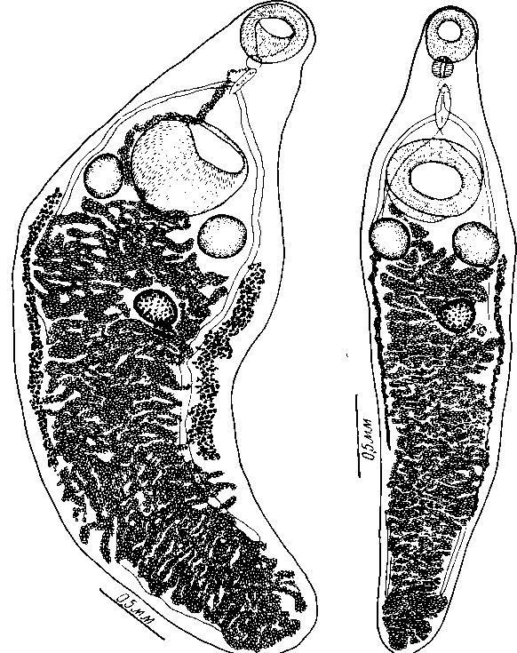 Промежуток между семенниками обычно занят петлями терминальной части матки. Яичник неправильно округлой формы, 0,22—0,30 мм в диаметре; удален на значительное расстояние от семенников, располагаясь позади одного из них. Тельце Мелиса лежит позади яичника. Желточники латеральные, экстрацекальные, частично распространяющиеся в цекальную область. Спереди они начинаются на уровне семенников или несколько позади них, а сзади заходят дальше середины тела, оканчиваясь на расстоянии 1,1—2,9 мм от заднего конца тела; длина желточников 1,2—2,4 мм. Матка сильно развита у старых экземпляров, у которых она распространяется по всему участку позади семенников интрацекально и цекально до заднего конца тела, не образуя пучков петель впереди семенников или в области брюшной присоски. Яйца с толстой оболочкой коричневого цвета; их размер 0,030—0,034 X 0,018—0,022 мм. Экскреторный пузырь очень удлиненный, свыше 1,6 мм.