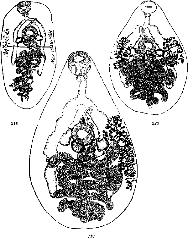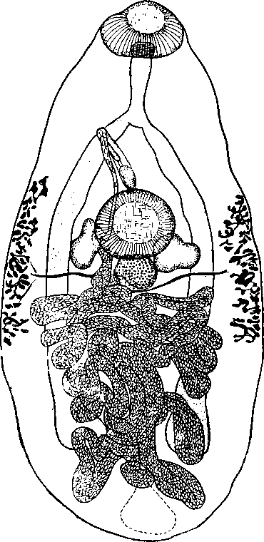 Половые отверстия располагаются сублатерально, в зоне бифуркации кишечника. Крупная половая бурса лежит поперек кишечного ствола и наискось к продольной оси тела, обычно достигая области брюшной присоски и проникая дорзально от нее; она достигает 0,36— 0,64x0,07—0,15 мм, содержит циррус, простатическую часть и мешковидный семенной пузырек. Vasa efferent!а соединяются в точке проникновения в половую бурсу. Семенники круглые или удлиненные, часто слегка лопастные, расположены частично в зоне брюшной присоски, с раздвинутыми полями; иногда они частично налегают на область кишечных стволов. Размеры их 0,26 X 0,18 мм и 0,78 X 0,70 мм.