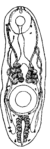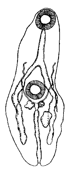 Описание церкария (по Миллеру, 1935). Форма тела церкария грушевидная. Кутикула гладкая без бугорков. Длина тела 1,12 мм; наибольшая ширина 0,269 мм. Ротовая присоска терминальная, размером 0,14 X 0,129 мм. Брюшная присоска 0,126 мм в диаметре, находится на расстоянии 0,28 мм кзади от ротовой присоски и на 0,504 мм кпереди от заднего конца тела церкария. Пищевод трубковидный, 0,104 мм длины. Ветви кишечника простые, трубковидные, слепо заканчиваются на расстоянии 0,13 мм от заднего конца тела церкария. Развилок кишечника находится значительно ближе к брюшной, чем к ротовой присоске. Экскреторный пузырь длинный трубковидный, расположен медианно между яичником и задним концом тела церкария. Выносящие экскреторные сосуды на уровне брюшной присоски разделяются на переднюю и заднюю ветви. Яичник и передний семенник расположены тотчас же позади брюшной присоски. Задний семенник находится возле левой кишечной ветви, позади яичника.