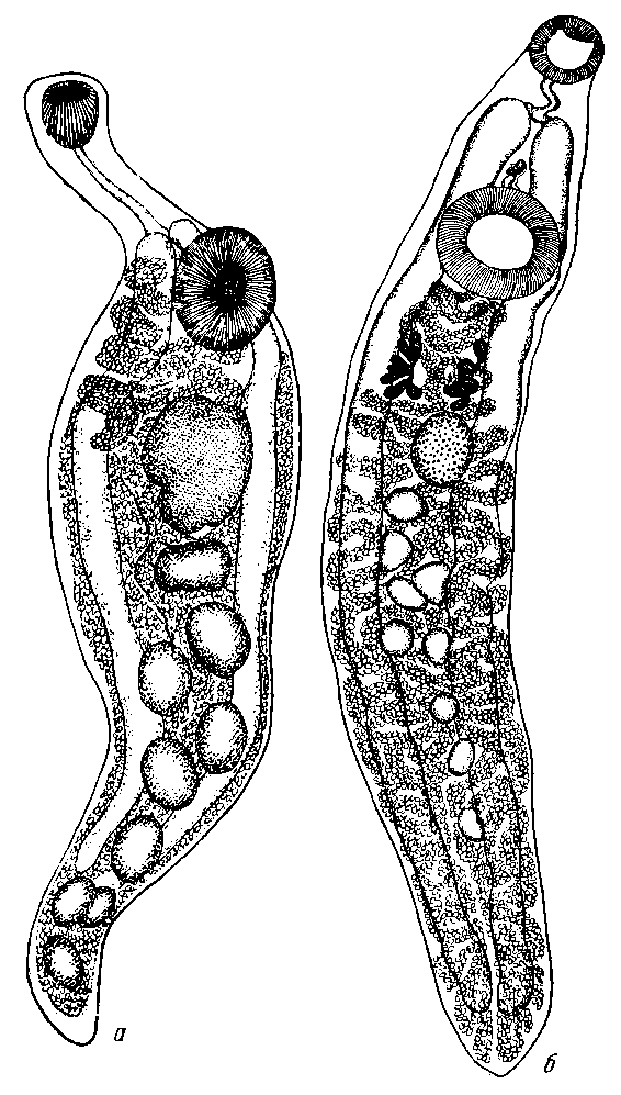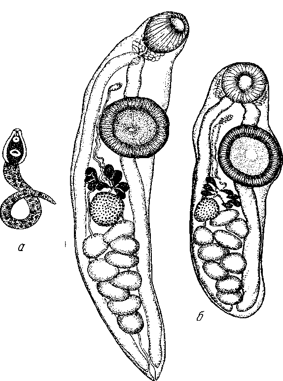 a — церкарий (Cercaria macrocerca) (по Филлиппи, 1854); б — молодые формы (по Пигулевскому)