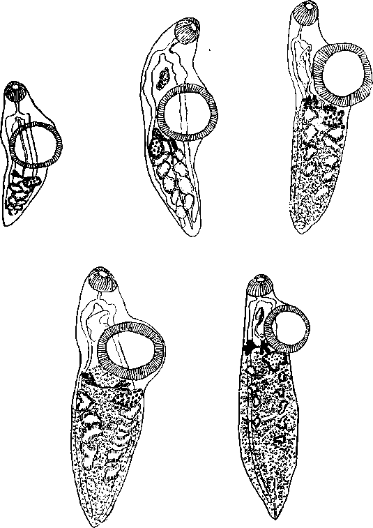 Столь значительное увеличение задней части тела связано с развитием половых органов и особенно матки. В связи с изменением в соотношении длины передней и задней частей тела червя в процессе маритогонии брюшная присоска, расположенная у молодых особей посередине между передним и задним концами тела червя, у взрослых половозрелых экземпляров находится уже в передней трети тела. Нужно, однако, заметить, что рост присосок претерпевает равномерные изменения с возрастом самого паразита.