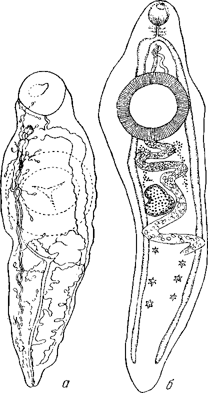 а — экскреторная система (по Берду, Винеру и Рейберу, 1940); б — дефект развития матки, желточников и семенников