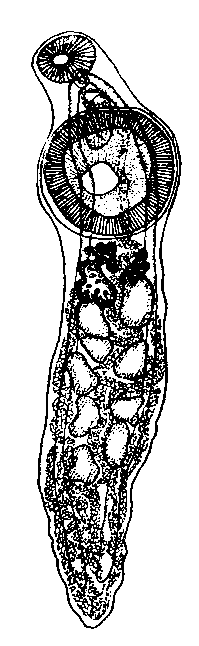 Соотношение размеров ротовой и брюшной присосок может быть выражено, как 1 : 1,8—2,3. Пищевод трубковидный, короткий, большей частью изогнутый, 0,14 мм длины и 0,03 мм ширины. Ветви кишечника также простые, трубковидные, одинакового диаметра, а именно 0,055 мм по всей длине вплоть до слепых концов. Кишечные ветви немного не доходят до заднего конца тела червя. Развилок кишечника находится вблизи ротовой присоски. Яичник, желточники и семенники расположены в непосредственной близости друг от друга.