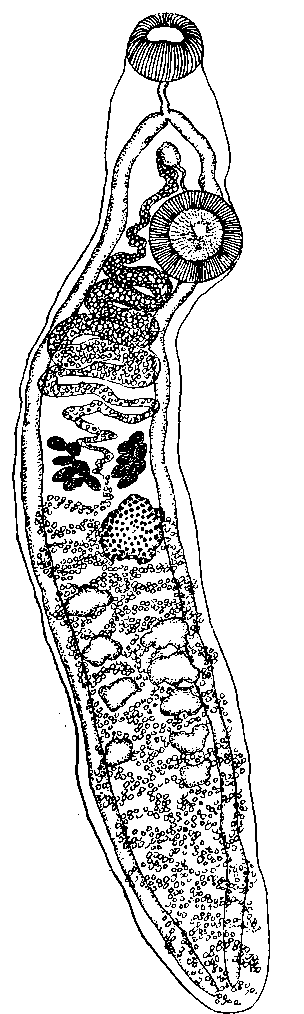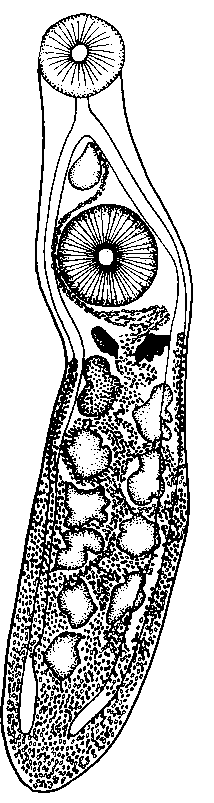 Ветви кишечника простые, трубковидные, немного не доходят до заднего конца тела червя. Развилок кишечника находится ближе к ротовой, чем к брюшной присоске. Семенники крупные, лопастные, расположены двумя группами на равном расстоянии от брюшной присоски и заднего конца тела червя. В одной группе пять, в другой четыре семенника, лежат близко один за другим возле кишечных ветвей. Мужской концевой половой аппарат представлен крупным грушевидной формы семенным пузырьком, расположенным между передним краем брюшной присоски и развилком кишечника, ближе к последнему. Половое отверстие открывается тотчас же кзади от развилка кишечника.