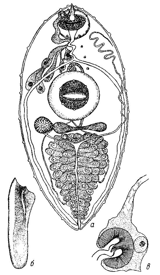 Помимо клеток и мышечных волокон, вдоль дорзальной и вентральной сторон хвоста проходит по одному тяжу. Хвост подвижен. Внутри камеры заключена трематода удлиненной яйцевидно-овальной формы, размером 0,24 X 0,10 мм. Ротовая присоска круглая, 0,06 мм в диаметре. Брюшная присоска также круглая, крупнее ротовой, 0,09 мм в диаметре. Стилет 0,026 мм длины и 0,007 мм ширины; передний конец его срезан под углом в 45°; лезвие образует хорошо выраженный изгиб по отношению к острию. На срезе находятся полулунные вырезки; на дорзальной стороне имеется шаровидное вздутие. Рукоятка стилета выражена нерезко; крылья невелики, сильно изогнуты и не доходят до половины длины стилета.