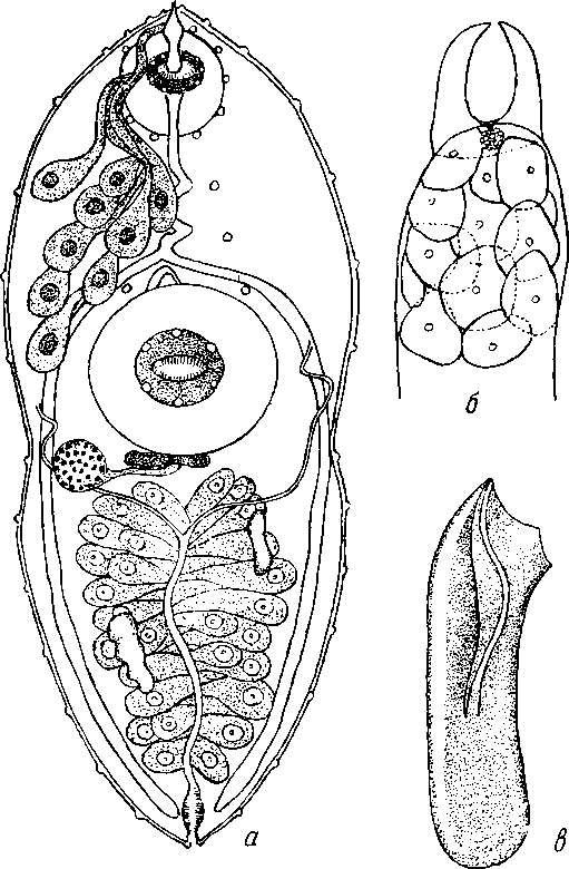a — церкарий; б — передний конец хвоста церкария; в — стилет церкария