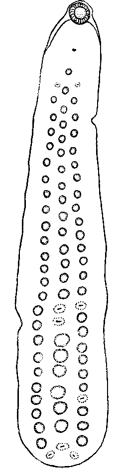 Матка идет одним восходящим стволом в виде правильно чередующихся поперечных петель, которые лежат между кишечными стволами, начиная от переднего края семенников.