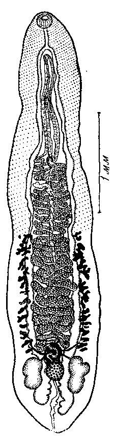 Описание вида. Длина тела 2,2—3,3 мм при ширине 0,56— 0,70 мм на уровне семенников. Передняя половина тела покрыта шипиками, расположенными косыми рядами. Пакеты желез расположены в три ряда в виде плоских сосочков на вентральной поверхности, по 12—13 пакетов в каждом ряду. Ротовая присоска достигает 0,066—0,092 мм длины и 0,079—0,099 мм ширины. Пищевод 0,106—0,132 мм длины. Кишечные ветви волнистые. Семенники состоят из 2—4 долей; они достигают 0,198— 0,257 мм длины и 0,132—0,151 мм ширины.