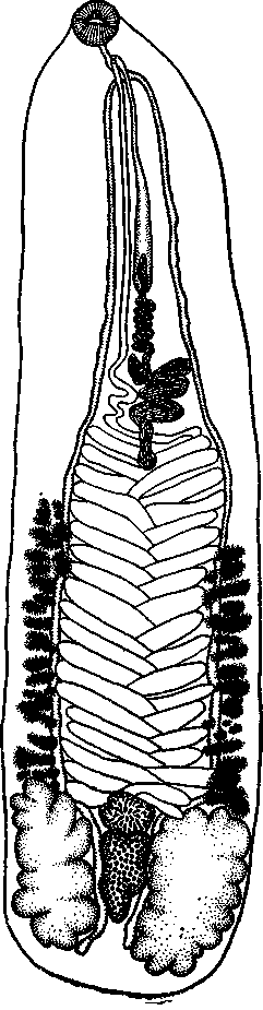 У отдельных экземпляров яичник бывает в большей или меньшей степени лопастной, а в единичных случаях даже гладкий, овальный; у большинства экземпляров он бывает слабо или умеренно лопастной спереди, с одной или двумя, обычно неодинаковыми лопастями на заднем крае. Крупное, неправильной формы тельце Мелиса лежит непосредственно впереди яичника и достигает 1/3—1/2 его размера. Желточники состоят из отдельных фолликулов, расположенных в латеральных участках тела, начиная от семенников и доходя до середины длины тела.