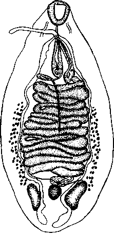 Удлиненный яичник расположен в задней части тела, между семенниками, и отделен от них кишечными стволами; размеры его 0,13—0,24 X 0,10—0,15 мм.