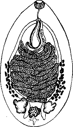 Крупная простатическая часть представляет собой основную массу мужских половых путей в половой бурсе. Маленький передний отрезок семенного пузырька лежит в задней части половой бурсы, тогда как больший, сильно скрученный, отрезок помещается кнаружи от нее. Обычно он слегка выступает вперед, вдоль половой бурсы, после чего соединяется с vas deferens дорзально от передг них петель матки. Половое отверстие расположено непосредственно позади развилка кишечника.