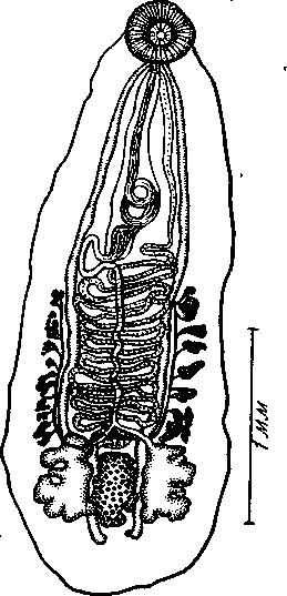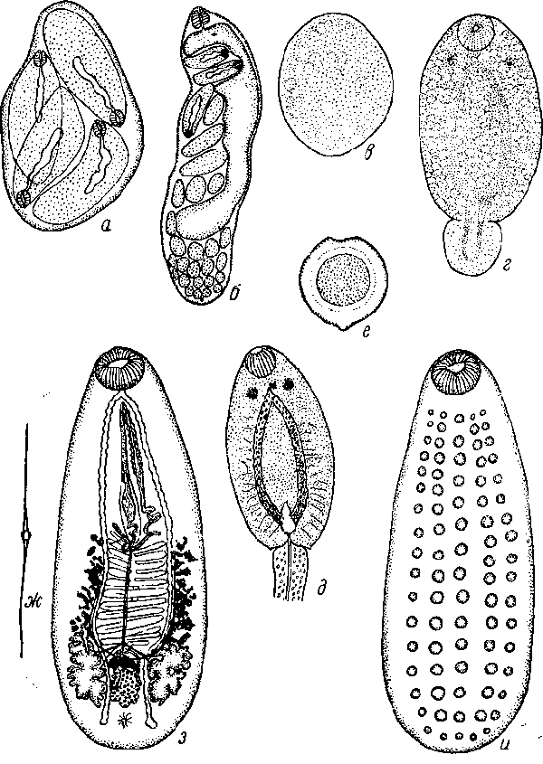а —спороциста; б — редия; в — зародыш церкария; г — развивающийся церкарий; д—передний отдел церкария; е— адолескарий; ж—яйцо; з— марита, общий вид и—марита, расположение вентральных желез