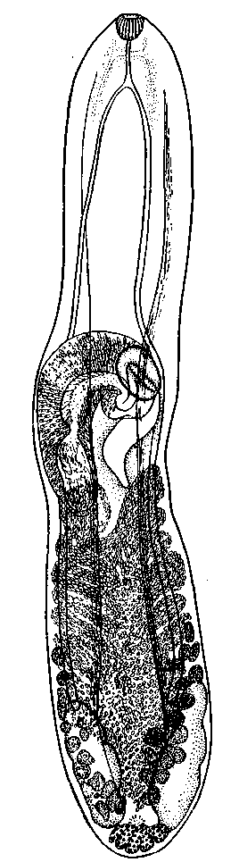 Семенники неизменны ни по форме, ни по местоположению; длина их варьирует от 0,38 до 0,83 мм, а ширина — от 0,1 до 0,2 мм. Яичник обычно имеет пять или шесть лопастей и достигает максимального размера 0,175 X 0,25 мм. Половое отверстие всегда располагается непосредственно кпереди от уровня середины тела. Желточники не подвержены никаким вариациям, заслуживающим упоминания.