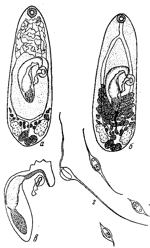 а и б — общий вид; в — концевой отдел половых органов, г — яйца