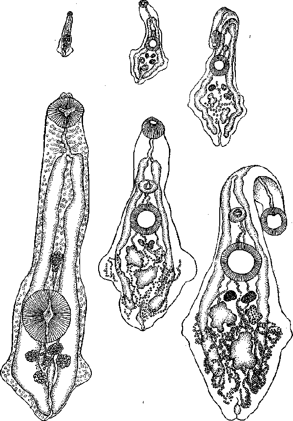 Таким образом, соотношение размеров ротовой и брюшной присосок резко отличается только у очень молодых паразитов. Взаимоотношения по величине между растущими семенниками и яичником остаются постоянными на всех этапах маритогонии. Семенники всегда крупнее яичников, причем передний семенник неизменно находится на уровне яичника. Желточники увеличиваются в размерах очень сильно: у половозрелых паразитов они в 6 раз крупнее, чем у самых молодых.
