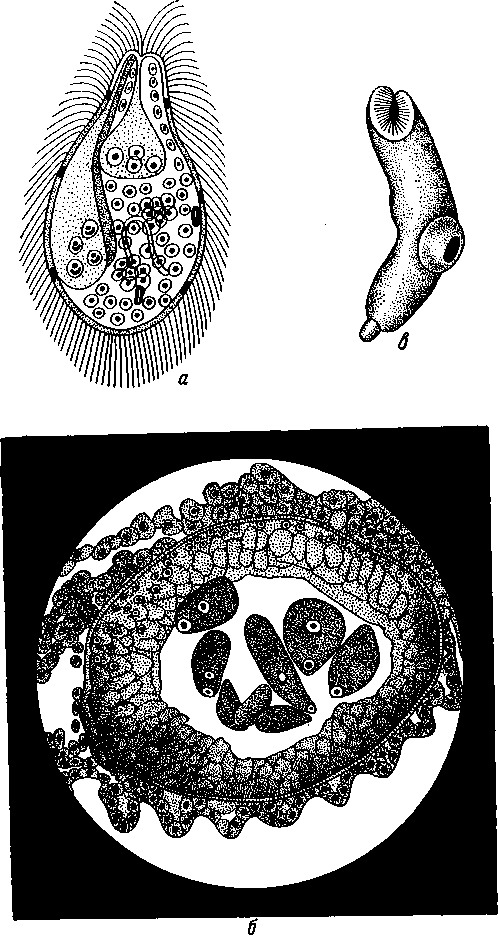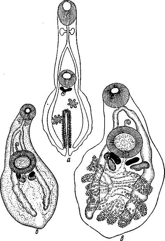 a — мирацидий; б — разрез через спороцисту; в — церкарий