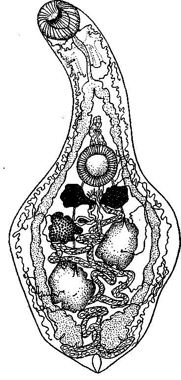Ветви кишечника простые, трубковидные, сравнительно толстые, доходят до заднего конца тела паразита. Семенники, яичник и желточники круглые, расположены компактно позади брюшной присоски, далеко от заднего конца тела червя. Семенники лежат слегка наискось, один против другого. Передний семенник 0,03 мм в диаметре, задний — 0,04 мм. Яичник круглый, тесно соединен с желточниками, 0,03 мм в диаметре. Желточники круглые, расположены возле заднего края брюшной присоски, 0,04 мм в диаметре.