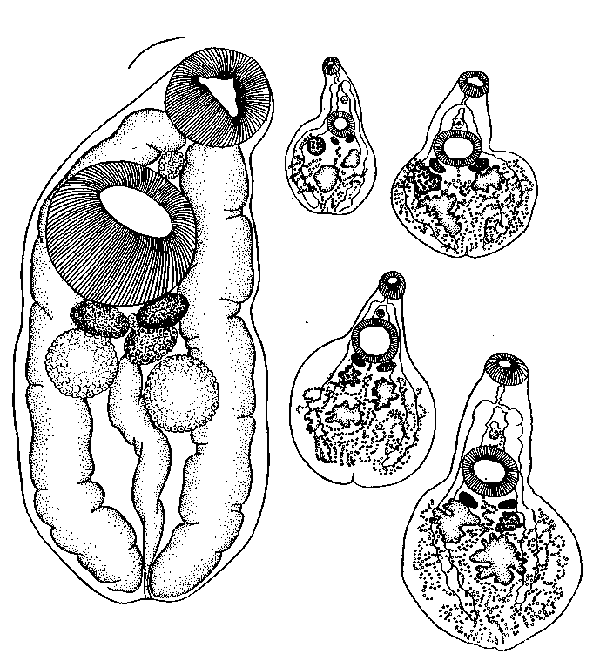 Последняя сильно расширяется, принимая дисковидную форму. Яичник, желточники и семенники раздвигаются и лежат не компактно, как у молодых форм, а более разреженно. Семенники и яичник становятся у более взрослых паразитов лопастными точно так же сильно развивается и матка.