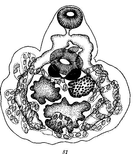 Яичник и семенники цельнокрайные. Петли матки не заходят кнаружи от кишечных ветвей - Phyllodistomum (Catoptroides) carangis Manter, 1947.