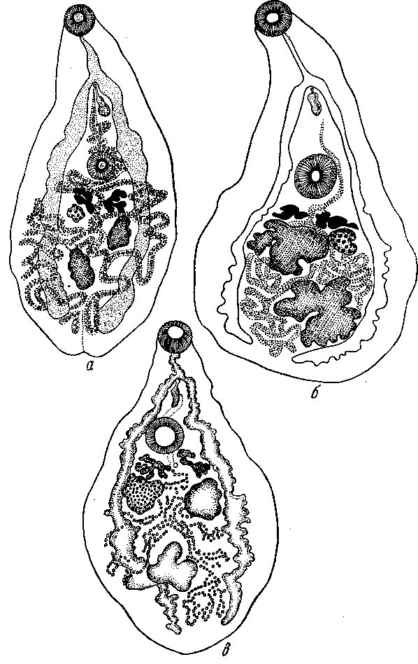 Phyllodistomum (Catoptroides) acceptum Looss, 1901 a — по Лооссу, 1901; 6 — по Османову, 1948; e — по Пигулевскому, 1953