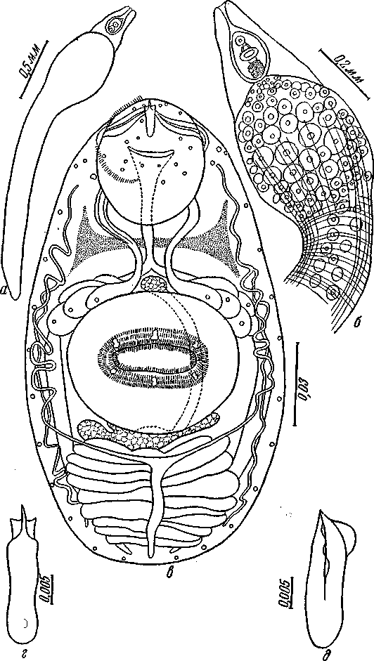 a— общий вид церкария; б — камера и олива хвоста церкария; в — церкарий, извлеченный из камеры; г и д — стилеты с дорзальной и латеральной стороны