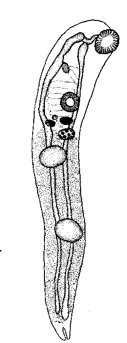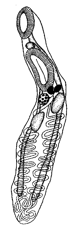 Соотношение размеров ротовой и брюшной присосок, как 1 : 1,45. Пищевод трубковидный, толстый и довольно длинный. Ветви кишечника простые, трубковидные, одинакового диаметра на всем протяжении, вплоть до слепых концов, которые находятся на некотором расстоянии от заднего конца тела червя. Яичник, желточники и семенники расположены компактно вблизи заднего края брюшной присоски, далеко от заднего конца тела червя. Семенники цельнокрайные, овальные, расположены между ветвями кишечника, наискось, один позади другого.