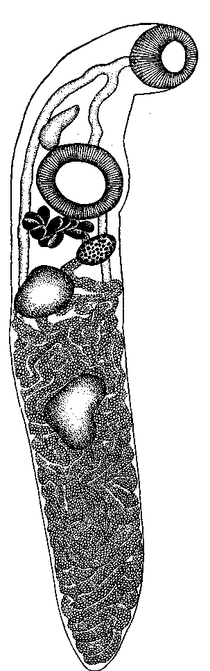 Задний семенник расположен почти посередине между брюшной присоской и задним концом тела червя и лежит между кишечными ветвями, несколько ближе к правому, чем к левому, кишечному стволу.