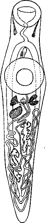 Передний семенник находится тотчас же позади правого желточника, несколько наискось и кзади от яичника, возле правой кишечной ветви. Задний семенник расположен посередине между брюшной присоской и задним концом тела паразита, сравнительно далеко кзади от яичника, возле левой кишечной ветви. Размер переднего семенника 0,25 X 0,24 мм, заднего — 0,38 X 0,20 мм.