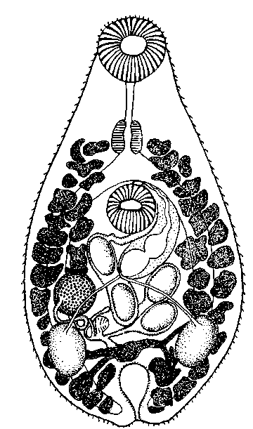 Матка описывает лишь 2—3 поворота и, как правило, содержит четыре яйца (но не более восьми). Яйца очень крупные (одинакового размера с семенниками), 0,08—0,1 мм длины у экземпляров, общая длина тела которых едва превышает 0,05 мм.